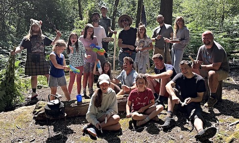 Make a den together. Sleep in the den together… Make fire. Make a fire outside your den. Use sharp knives next to the fire outside your den. Hunt each other in the night. Make traps. Get messy. Play games. Play more games.  Hang out.  With your son, or daughter, or both, and a bunch of other dads and kids.