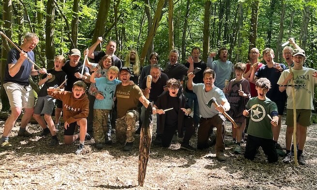 In a beautiful piece of private woodland and in a lively village atmosphere, we blend bushcraft, survival and the art of mucking around into a thread of activities that are very achievable and a lot of fun. As a big manly tribe, we shall cook and eat together, make friends, learn skills, tell fireside stories and have rip-roaring adventures together, just like dads and kids have for thousands of years.